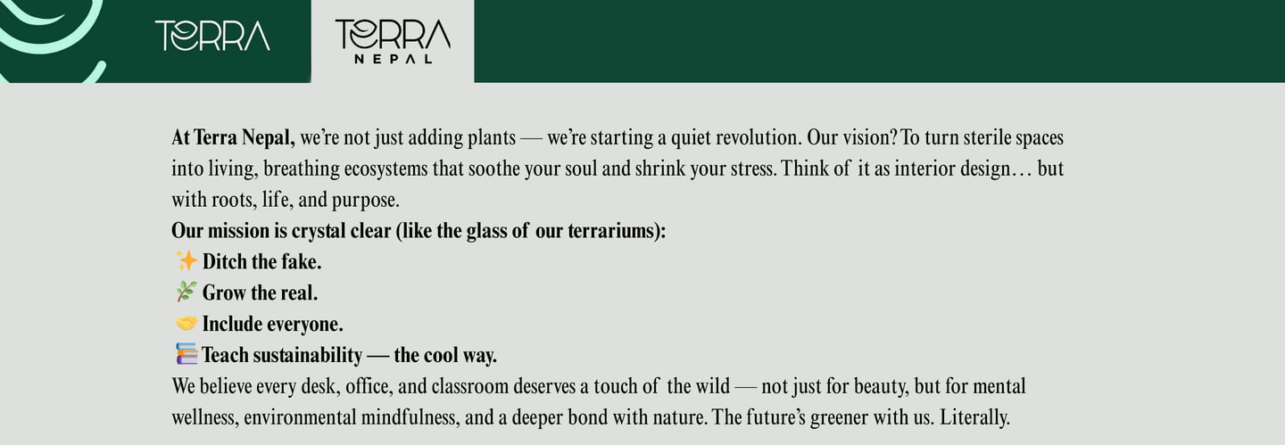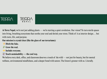 At Terra Nepal, our journey is fueled by a deep belief in the power of nature to heal, inspire, and transform. We are more than just creators of terrariums; we are driven by a vision to bring nature back into the concrete jungles that have come to dominate modern life. Our vision is simple yet profound: to build a world where natural, self-sustaining ecosystems replace artificial decor, where every office, home, and public space is filled with the soothing, life-giving presence of real plants.